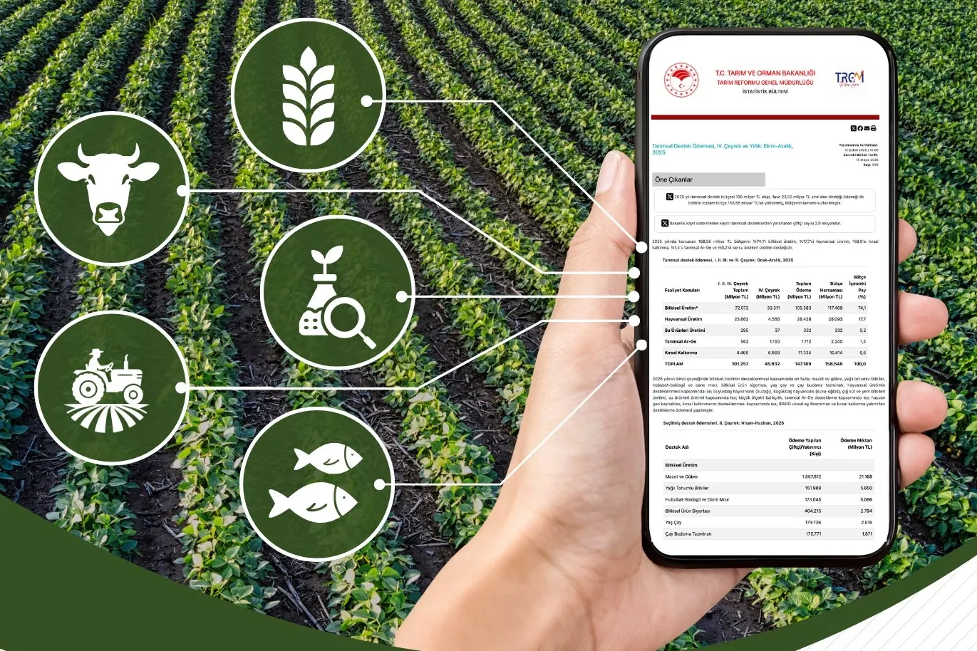 Tarım ve Orman Bakanlığı, 2025 yılı tarımsal destek ödemelerini açıkladı. Toplam 158,55 milyar TL’lik bütçenin tamamı kullanılırken, 2,9 milyon çiftçi çeşitli desteklerden yararlandı.
