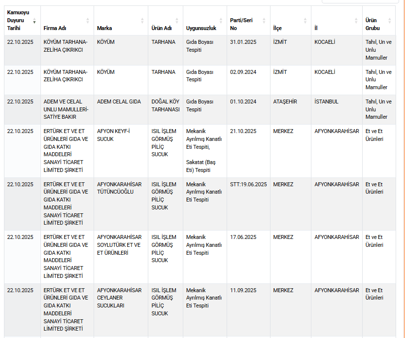 22 Ekim 2025 tarihli güncel listede özellikle sucuk, börek, lahmacun ve tarhana gibi geleneksel ürünlerde yapılan hileler dikkat çekti.