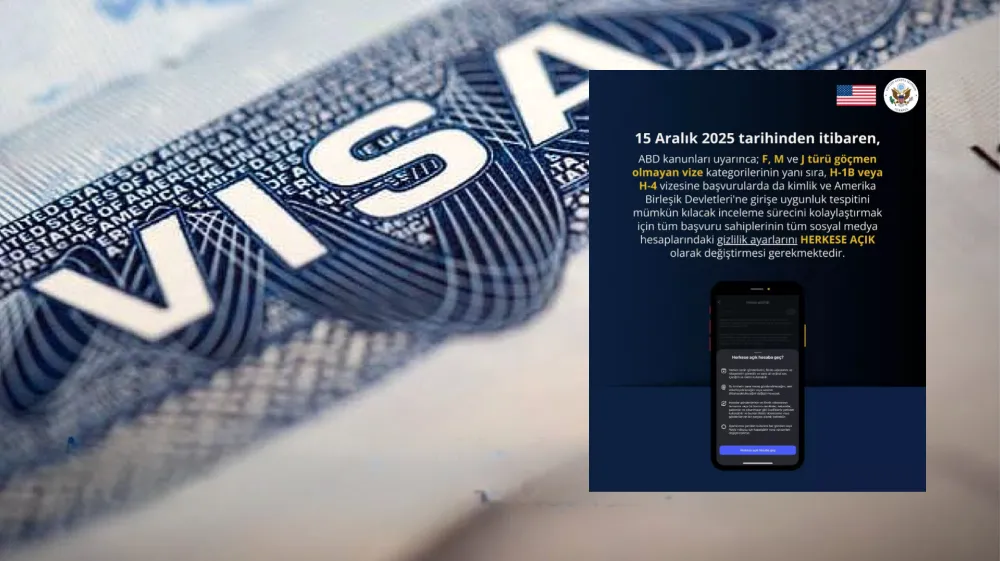 “15 Aralık 2025 tarihinden itibaren, ABD kanunları uyarınca; F, M ve J türü göçmen olmayan vize kategorilerinin yanı sıra, H-1B veya H-4 vizesine başvurularda da kimlik ve Amerika Birleşik Devletleri’ne girişe uygunluk tespitini mümkün kılacak inceleme sürecini kolaylaştırmak için tüm başvuru sahiplerinin tüm sosyal medya hesaplarındaki gizlilik ayarlarını herkese açık olarak değiştirmesi gerekmektedir.”