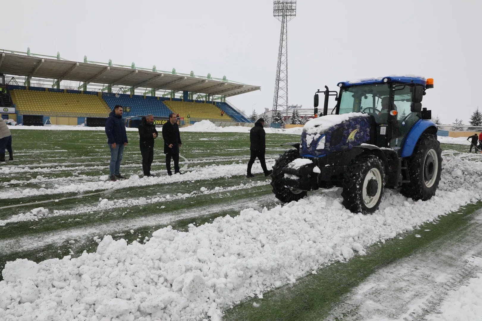Gençlik ve Spor İl Müdürü Ahmet Çelebi, sahadaki ekipleri organize ederek temizlik çalışmalarını koordine etti. Spor Hizmetleri Müdürü Cemil Budak’ın traktörün başına geçmesi oldu. Budak, kar temizleme aparatının bağlı olduğu traktöre binerek bizzat sahaya girdi ve kar temizleme çalışmalarına katıldı.
