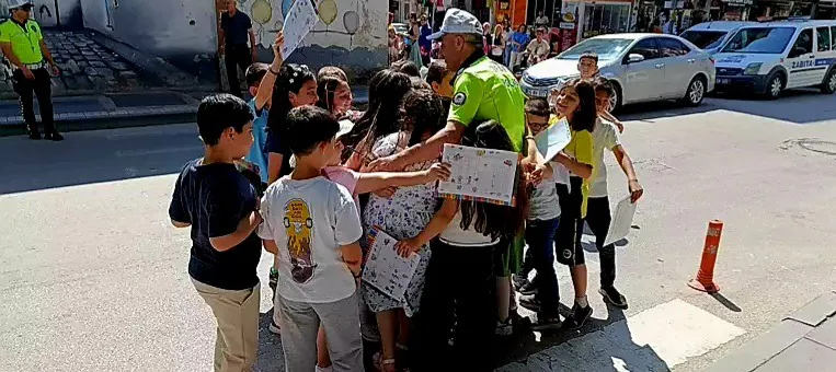 Kent merkezindeki bir ilkokulda, öğrenciler karnelerini aldıktan sonra okul önündeki yaya geçidinde yıl boyunca görev yapan trafik polisi Ömer Kurt’un yanına koştu. “Teşekkürler Ömer Amca” diyerek sarılan çocuklar, güvenli geçişlerini sağladığı için kendisine minnettarlıklarını dile getirdi.
