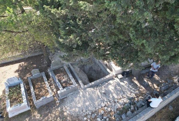Olay yerinde yapılan incelemelerde, definecilerin mezarlıkta metrelerce kazı yaptığı ve kemiklerin etrafa saçıldığı, ayrıca kazıda kullanılan eldiven ve diğer araç-gereçlerin de ortada bırakıldığı dron kamerasıyla görüntülendi.