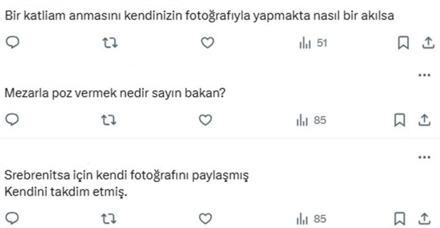 Srebrenitsa Soykırımı’nın 30. yıl dönümünde Aile ve Sosyal Hizmetler Bakanı Mahinur Özdemir Göktaş’ın sosyal medya paylaşımı tartışmalara neden oldu. Anma mesajında Soykırım Anıtı önünde çektirdiği kişisel fotoğrafını paylaşan Bakan Göktaş’a sosyal medyada tepki yağdı.