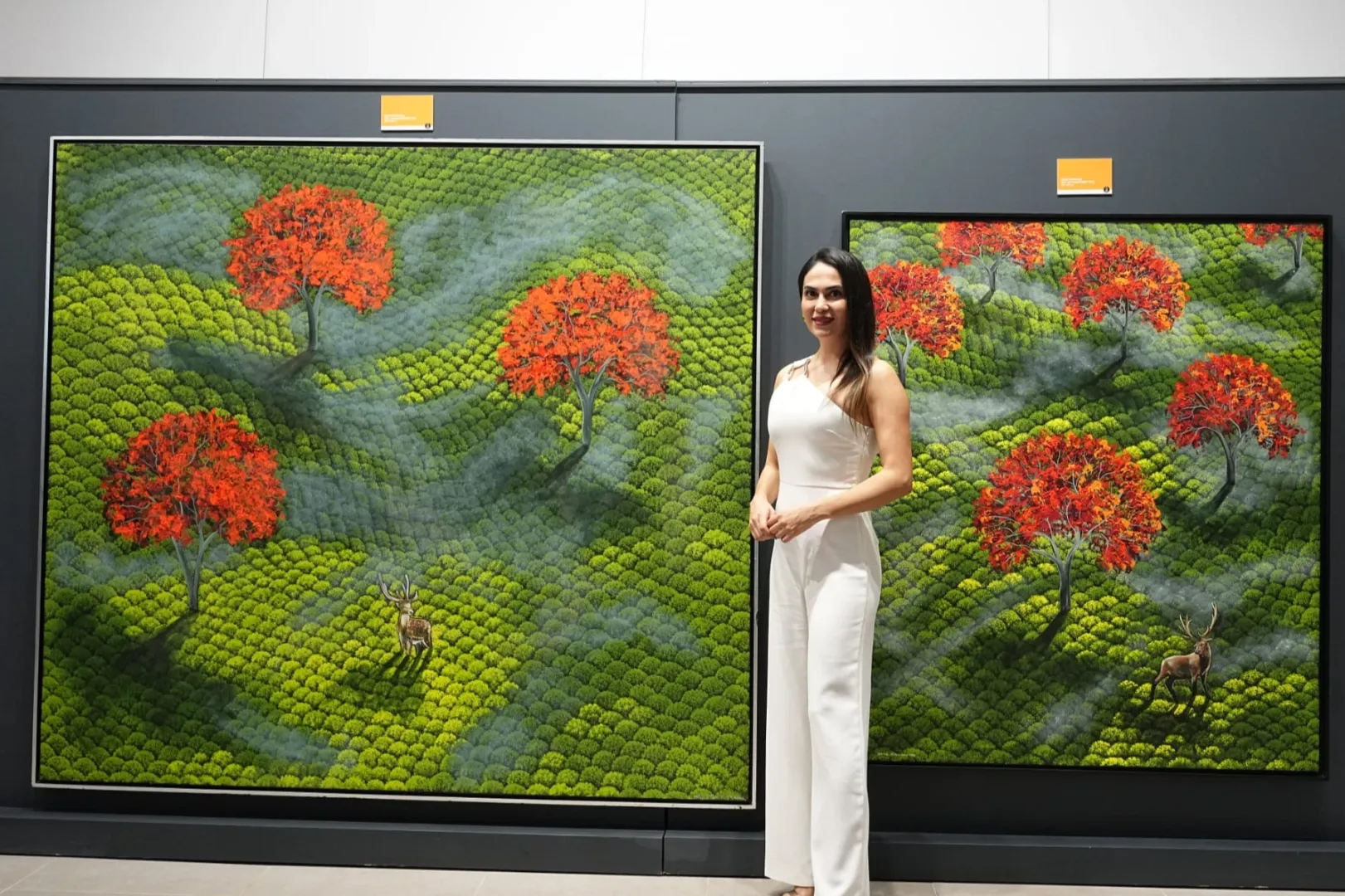 Serginin genç isimlerinden Melisa Özgür, geometrik soyutlama ve kozmik motifleri buluşturan kompozisyonlarıyla dikkat çekiyor. Katmanlı yüzeyler ve güçlü renk enerjisi, izleyiciye yeni bir görsel deneyim sunuyor.