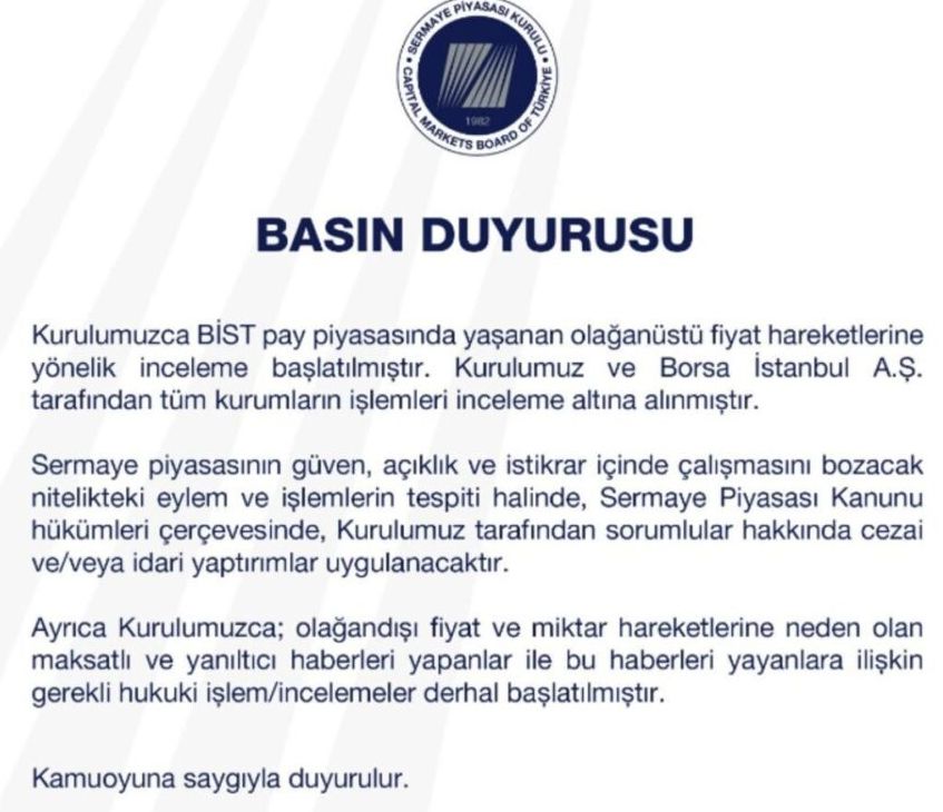 Ayrıca, sermaye piyasasında güven ve istikrarı bozacak herhangi bir eylemin tespit edilmesi halinde, Sermaye Piyasası Kanunu çerçevesinde sorumlular hakkında cezai veya idari yaptırımlar uygulanacağı vurgulandı.