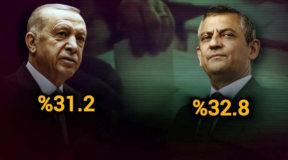 Araştırmaya göre, bu Pazar seçim olsa Cumhuriyet Halk Partisi (CHP) yüzde 32,8 oy oranıyla birinci parti konumuna yükselirken, Adalet ve Kalkınma Partisi (AK Parti) yüzde 31,2 ile ikinci sırada yer aldı. İki büyük parti arasındaki fark ise yalnızca 1,6 puan olarak ölçüldü.