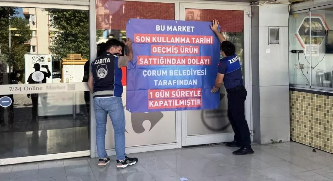 Çorum’da belediye ekipleri tarafından yapılan denetimlerde, bir zincir market şubesinde son kullanma tarihi geçmiş ürünler tespit edildi. Daha önce aynı ihlal nedeniyle uyarı cezası verilen market, kurallara aykırı davranışını tekrarlayınca 1 gün süreyle kapatıldı.