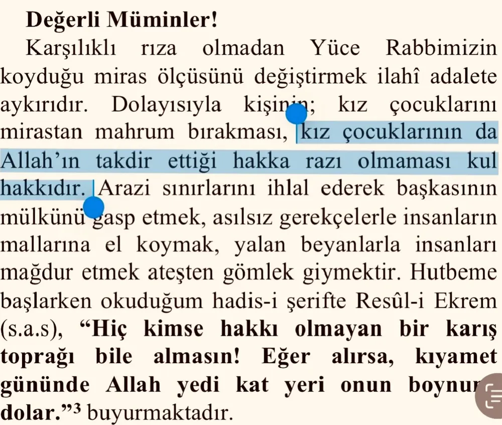 Hutbede öne çıkan ifadeler şöyle: “Karşılıklı rıza olmadan Yüce Rabbimizin koyduğu miras ölçüsünü değiştirmek ilahi adalete aykırıdır. Bu nedenle, kişinin kız çocuklarını mirastan mahrum bırakması, kız çocuklarının da Allah’ın takdir ettiği hakka razı olmaması kul hakkıdır.”