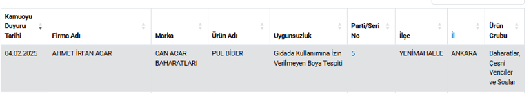 Güncellenen listede, sahtecilik tespit edilen ürünler arasında boyalı pul biber, tohum yağı karıştırılan zeytinyağı, kanatlı et ve sakatat içerikli pide ve köfte gibi ürünler bulunuyor. Bakanlık, bu ürünlerin sağlığı tehdit edici nitelikte olduğuna ve halk arasında büyük bir risk oluşturduğuna dikkat çekiyor.