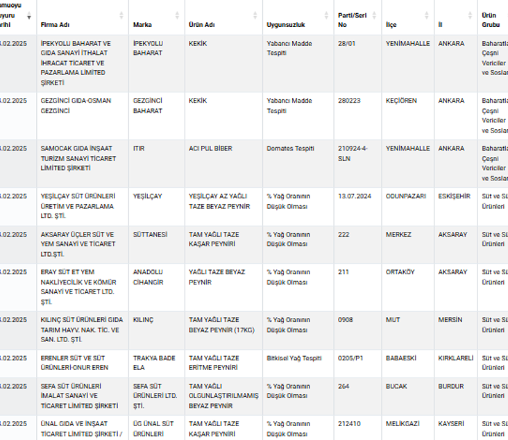Tarım ve Orman Bakanlığı, vatandaşların sağlığını tehlikeye atacak şekilde bozulmuş, değiştirilmiş veya taklit ürünlerle ilgili yaptığı denetimleri sıklaştırarak, yeni bir liste yayımladı. Bakanlık, gıda güvenliği açısından kritik öneme sahip olan ve tağşiş yapıldığı kesinleşmiş ürünleri kamuoyuna duyurdu.