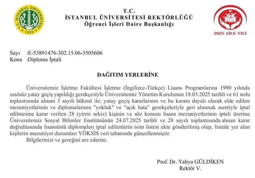 İstanbul Üniversitesi Yönetim Kurulu’nun 18 Mart 2025 tarihli toplantısında alınan karara göre, 1990 yılında yapılan yatay geçişlerin 'usulsüz' olduğu gerekçesiyle 28 kişinin mezuniyetlerinin ve diplomalarının iptal edilmesine karar verildi. Üniversitenin resmi yazısında şu ifadeler yer aldı: