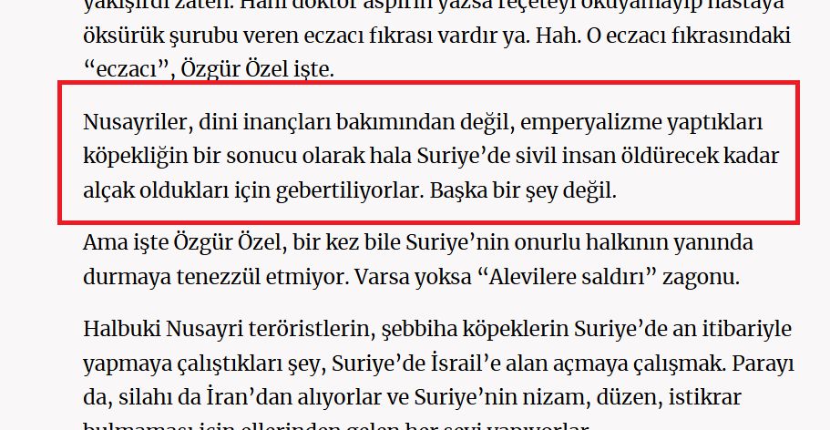 Kılıçarslan, yazısında Suriye’deki Alevilere yönelik saldırıların sadece dini bir ayrımcılıkla açıklanamayacağını, bunun ardında daha derin bir emperyalist güdülenme olduğunu savundu. 'Suriye’deki Nusayri teröristlerin saldırılarının arkasında, sadece dini inançları değil, emperyalizme hizmet etme çabası var' diyen Kılıçarslan, Alevilerin katliamına karşı ses çıkaranları 'teröristlerin köpeklik etmekle' suçladı.