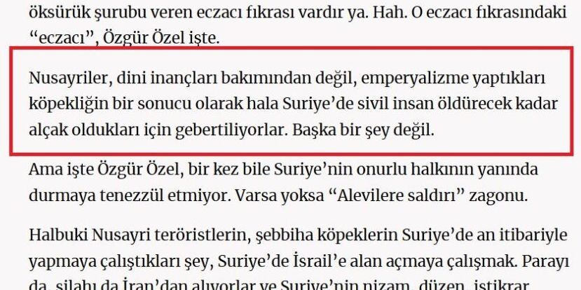 Yeni Şafak yazarı İsmail Kılıçarslan, Suriye'deki Alevilere yönelik saldırılarla ilgili sert bir yazı kaleme alarak, CHP Genel Başkanı Özgür Özel’in açıklamalarına tepki gösterdi. Kılıçarslan, Suriye’deki cihatçı saldırılara ve Alevilere yönelik şiddete karşı yapılan açıklamaları sert bir şekilde eleştirerek, Türkiye’deki bazı siyasi figürlerin “emperyalistlerin hizmetinde” hareket ettiğini öne sürdü.