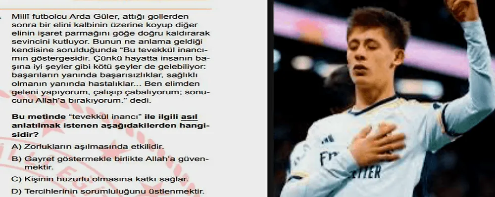 Sınavda en çok konuşulan sorulardan biri, Din Kültürü testinde yer aldı. Real Madrid ve A Milli Takım forması giyen genç futbolcu Arda Güler’in bir maç sonrası yaptığı gol sevinci ve 'Bu tevekkül inancımın göstergesidir' ifadesi, bir soru metnine konu oldu. Soruda, tevekkül kavramının anlamı sorgulandı.