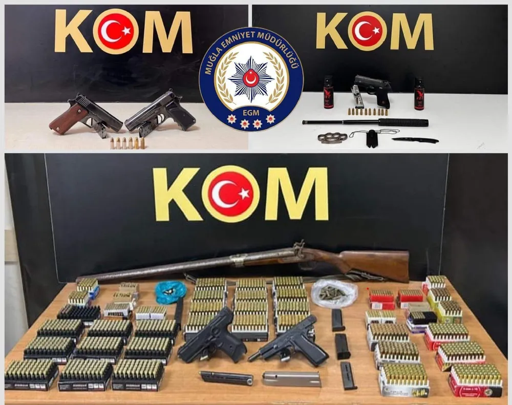 Muğla İl Emniyet Müdürlüğü Kaçakçılık ve Organize Suçlarla Mücadele (KOM) Şube Müdürlüğü ve İstihbarat Şube Müdürlüğü ekiplerinin ortaklaşa düzenlediği operasyonda, ruhsatsız silahlar, fişekler, uyuşturucu madde ve çeşitli suç aletleri ele geçirildi. Operasyonda 12 şüpheli yakalanarak gözaltına alındı.