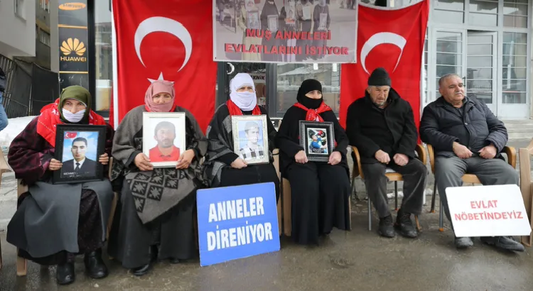 Muş'ta, çocuklarının terör örgütü PKK tarafından kaçırıldığını iddia eden ailelerin, DEM Parti İl Başkanlığı binası önünde başlattıkları eylem devam ediyor. Çocuklarına kavuşma ümidiyle her çarşamba bir araya gelen aileler, 'Anneler direniyor', 'Evlat nöbetindeyiz' ve 'Artık yeter yakamızdan düşün' yazılı pankartlar açarak tepkilerini dile getirdi.
