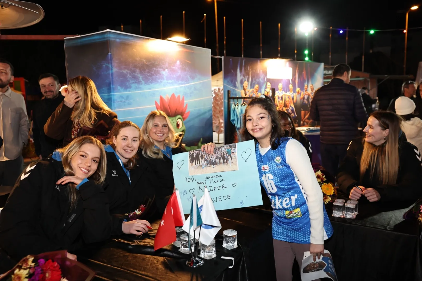 Konuşmaların ardından voleybolcular, kendileri için ayrılan alana geçerek taraftarların forma, atkı ve çeşitli ürünlerini imzaladı. Takım maskotu Zıpır’ın da renk kattığı etkinlikte sporcular, sevenleriyle bol bol fotoğraf çektirip sohbet etme imkânı buldu.