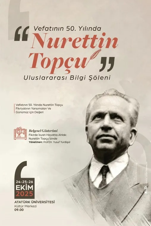 Bu kapsamda, felsefeci, sosyolog, yazar ve öğretmen kimliğiyle Türk düşünce hayatına yön vermiş Nurettin Topçu’nun fikir mirasını, ahlâk anlayışını ve kültürel katkılarını gündeme taşıyacak etkinlik Erzurum’da gerçekleştirilecek. Akademisyenler, yazarlar ve fikir insanları, Topçu’nun eserlerini ve düşüncelerini günümüz perspektifiyle ele alacak.