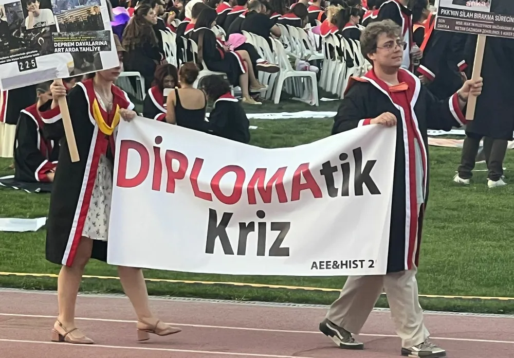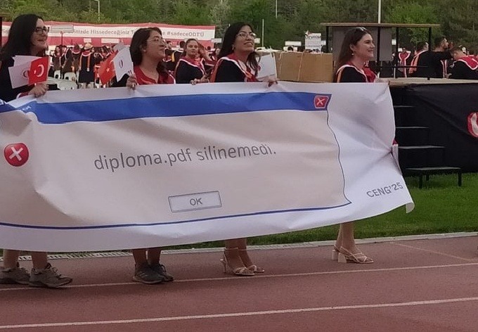 Orta Doğu Teknik Üniversitesi'nin (ODTÜ) 2024-2025 mezuniyet töreni, siyasi ve toplumsal mesajların öne çıktığı pankartlarla gündeme oturdu. Mezuniyet töreninde Ekrem İmamoğlu'nun diplomasının iptali ve 19 Mart’ta yaşanan polis müdahalesi sıkça vurgulandı.