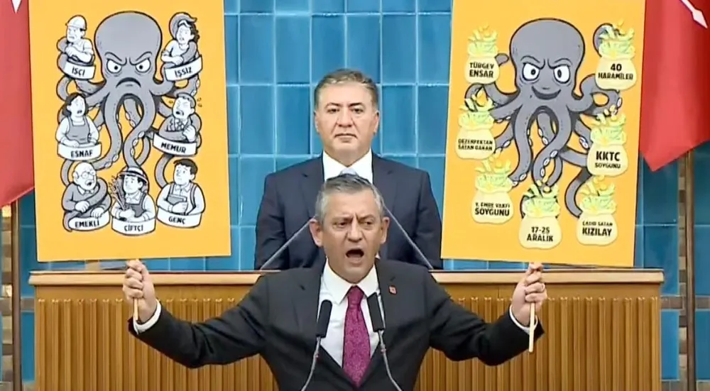 CHP lideri, “Ahtapotun diğer kollarını da göstereyim” diyerek iktidara yakın şirketleri ve bazı vakıfları hedef aldı. Beşli çete, 17-25 Aralık süreci, Kızılay’ın çadır satışı, KKTC büyükelçiliği iddiaları, Türgev ve Ensar gibi yapıları örnek gösterdi.