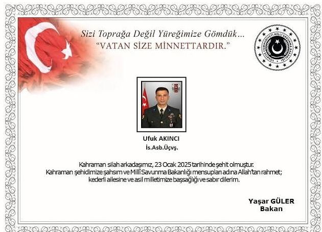 'Pençe-Kaplan operasyonu bölgesinde, bölücü terör örgütü mensupları tarafından açılan taciz ateşi sonucu kahraman silah arkadaşımız İstihkam Astsubay Üstçavuş Ufuk Akıncı, ağır yaralanmış ve hastaneye kaldırılmıştır. Yapılan tüm müdahalelere rağmen 23 Ocak 2025 tarihinde şehit düşmüştür.'