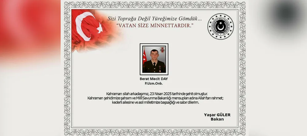 Piyade Uzman Onbaşı Berat Mecit Day, Türk Silahlı Kuvvetleri’nin kahraman mensubu olarak anılacak ve ailesi ile milletimize başsağlığı dilekleri sunulacak. TSK, operasyonlara devam ederken, şehitlerin hatırasına saygı gösterilmesi gerektiği vurgulandı.
