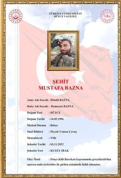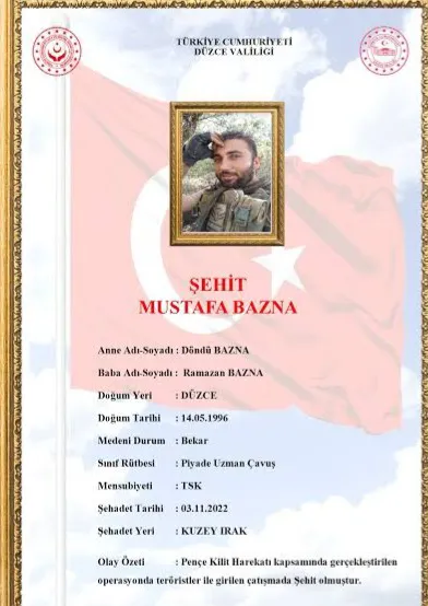 Milli Savunma Bakanlığı (MSB), Pençe-Kilit operasyonu bölgesinde, 03 Kasım 2022 tarihinde bölücü terör örgütü mensuplarının gerçekleştirdiği roket saldırısının ardından kayalıklardan düşerek şehit olan Piyade Uzman Çavuş Mustafa Bazna'nın naaşına 29 Ocak 2025 tarihinde ulaşıldığını duyurdu.