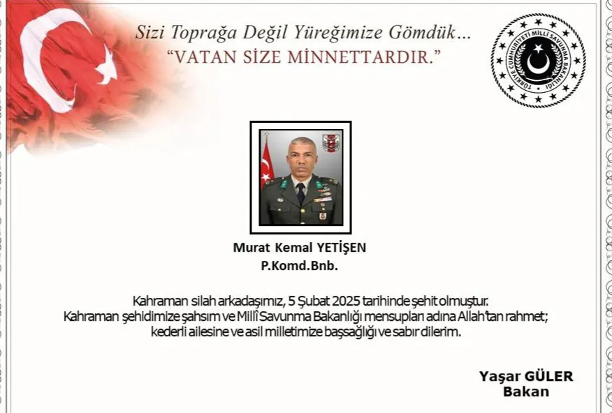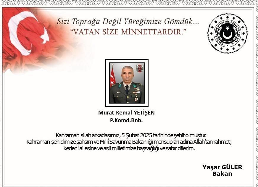 Bakanlıktan yapılan açıklamada, arama-tarama faaliyetleri sırasında bölücü terör örgütü mensuplarıyla çıkan çatışmada bir askerin şehit olduğu belirtilerek, “Kahraman silah arkadaşımız Piyade Komando Binbaşı Murat Kemal Yetişen, görev esnasında şehit olmuştur. Aziz şehidimize Allah’tan rahmet, ailesine, Türk Silahlı Kuvvetlerimize ve milletimize sabır diliyoruz. Acımız büyüktür.” ifadelerine yer verildi.