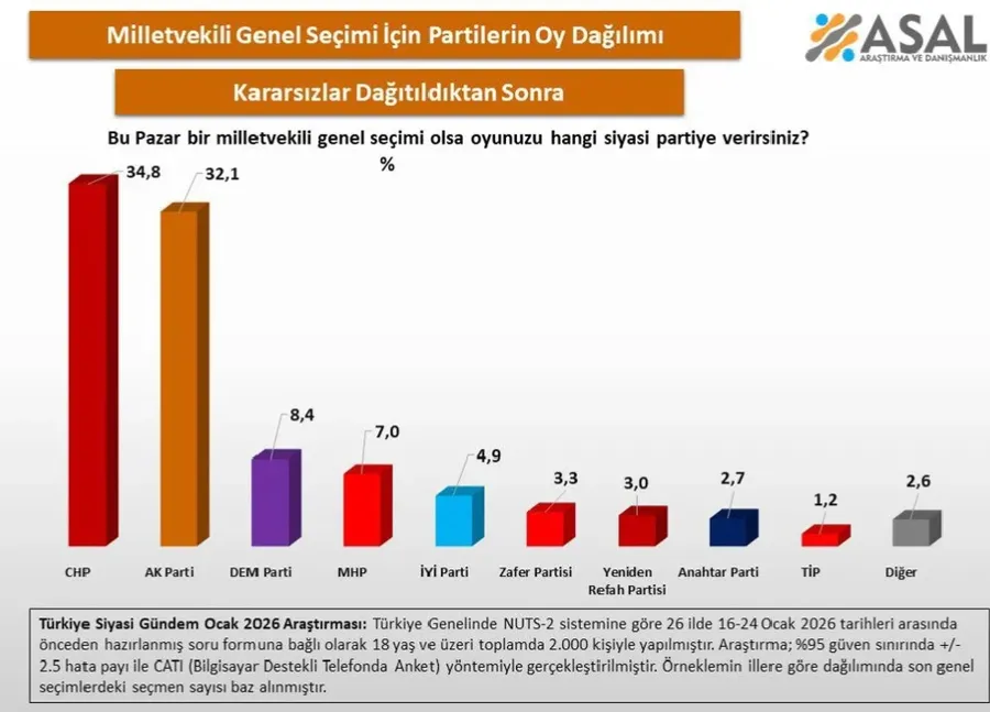 Asal Araştırma tarafından gerçekleştirilen “Türkiye Siyasi Gündem Ocak 2026 Araştırması”, kararsız seçmenlerin oranıyla öne çıktı. 26 ilde, 16-24 Ocak 2026 tarihleri arasında yapılan çalışmada 18 yaş ve üzeri 2 bin kişiyle yüz yüze görüşüldü.