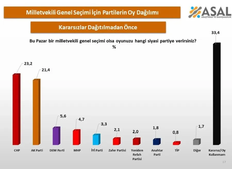 Kararsızlar dağıtılmadan önce Cumhuriyet Halk Partisi yüzde 23,2 ile ilk sırada yer alırken, Adalet ve Kalkınma Partisi yüzde 21,4 ile ikinci sırada ölçüldü. Bu sonuçlar, iki büyük parti arasındaki farkın sınırlı olduğunu ortaya koydu.
