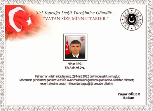 Milli Savunma Bakanı Yaşar Güler, şehit Astsubay Kıdemli Çavuş Nihat İrgi için başsağlığı mesajı yayımladı. Bakan Güler'in sosyal medya hesabından paylaşılan mesajında, 'Kahraman silah arkadaşımız, 29 Mart 2025 tarihinde şehit olmuştur. Kahraman şehidimize şahsım ve Milli Savunma Bakanlığı mensupları adına Allah'tan rahmet; kederli ailesine ve asil milletimize başsağlığı ve sabır dilerim' ifadeleri yer aldı.