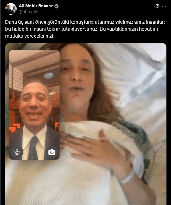 Başarır paylaşımında, “Daha üç saat önce görüntülü konuştum; utanmaz, sıkılmaz, arsız insanlar! Bu halde bir insanı tekrar tutukluyorsunuz! Bu yaptıklarınızın hesabını mutlaka vereceksiniz!” ifadelerine yer verdi.