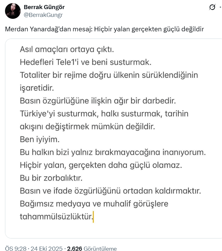 Tele1 çalışanı gazeteci Berrak Güngör, gözaltında bulunan Genel Yayın Yönetmeni Merdan Yanardağ’ın açıklamasını paylaştı. Yanardağ, kanalına kayyum atanmasını “basına yönelik yeni bir operasyon” olarak değerlendirdi.