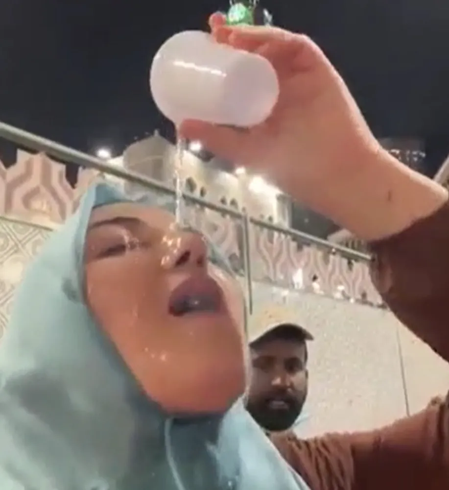 Paylaşılan videoda, bir kadının zemzem suyunu yüzüne döktüğü anların cep telefonu kamerasıyla kaydedildiği görülüyor. Görüntülerin sosyal medya platformlarında paylaşılmasının ardından video binlerce kez izlenirken, çok sayıda yorum ve tepki de beraberinde geldi.