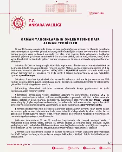 Ankara Valiliği, orman yangınlarıyla mücadele kapsamında kritik bir karar alarak, 10 Haziran-30 Eylül tarihleri arasında milli parklar, mesire alanları ve tabiat parkları dışındaki tüm ormanlık bölgelere girişlerin yasaklandığını duyurdu. Yapılan açıklamada, ormanlarda insan ve araç yoğunluğunun artmasıyla birlikte ülke genelinde artan yangın riski sebebiyle bu tedbirlerin zorunlu hale geldiği vurgulandı.