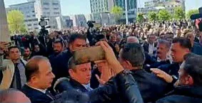 Törenin ardından kurmaylarıyla birlikte AKM'den çıkan Özgür Özel’e, kalabalığın içinden hızla yaklaşan bir kişi yüzüne sert bir tokat attı. Saldırının ardından kısa süreli bir panik yaşandı. Görüntülerde, darbenin etkisiyle başını tutan Özel’in şaşkınlığı dikkat çekti. Güvenlik ekipleri saldırgana anında müdahale etti.