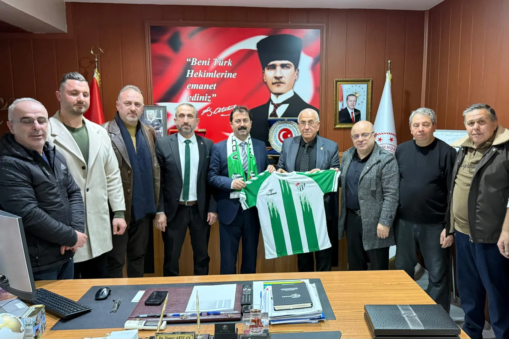 Sıcak ve samimi bir ortamda gerçekleşen ziyarette, İl Müdürü Yunuz Arslan’a isminin yazılı olduğu forma ile atkı takdim edildi.