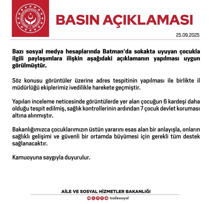 “Yapılan inceleme neticesinde görüntülerde yer alan çocuğun 6 kardeşi daha olduğu tespit edilmiş, sağlık kontrollerinin ardından 7 çocuk devlet koruması altına alınmıştır. Bakanlığımızca çocuklarımızın üstün yararını esas alan bir anlayışla, onların sağlıklı gelişimi ve güvenli bir ortamda büyümesi için gerekli tüm destek sağlanacaktır.”