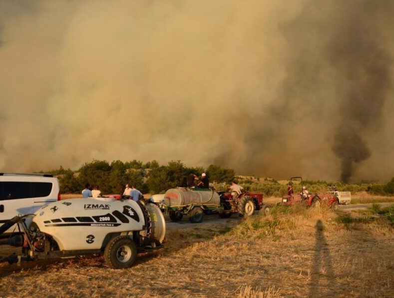 Yangına sadece profesyonel ekipler değil, çevre köy ve ilçelerden gelen gönüllüler de traktör ve su tanklarıyla destek veriyor. Tahliye edilen köylerin boşaltılması sırasında köy camilerinden yapılan anonslarla halk uyarıldı. Birçok vatandaş yangın bölgesinde arazöz ve tankerlerin ulaşamadığı alanlarda yangına müdahale ediyor.