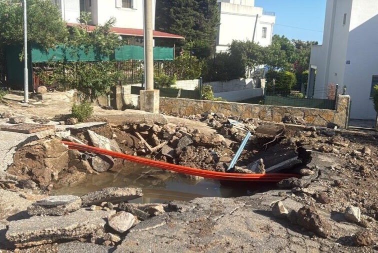 Muğla’nın Bodrum ilçesinde yaşanan bir altyapı arızası, vatandaşları zor durumda bıraktı. Yahşi Mahallesi Kargı Caddesi üzerinde bulunan ana isale hattında bugün saat 16.30 sıralarında henüz belirlenemeyen bir nedenle patlama meydana geldi. Patlamanın etkisiyle asfalt yol çöktü ve yol ortasında büyük bir çukur oluştu.
