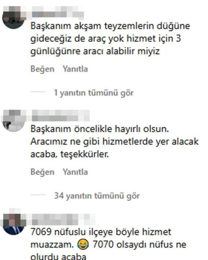 Paylaşımın ardından çok sayıda yorum geldi. Bir kullanıcı, aracın teyzesinin düğününde kullanılmasını isterken, bir başka kullanıcı ise aracın hangi hizmetlerde kullanılacağını sordu. Bazı yorumlar esprili, bazıları ise eleştirel tonda yapıldı.