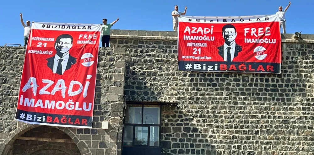 CHP’nin tutuklu İstanbul Büyükşehir Belediye Başkanı ve Cumhurbaşkanı adayı Ekrem İmamoğlu’na yönelik destek kampanyası, kamuya açık alanlardaki yasaklara rağmen artarak devam ediyor. Son olarak, Diyarbakır Surlarına asılan Kürtçe 'İmamoğlu'na özgürlük' yazılı afişler polis müdahalesiyle indirildi. Olay sonrası CHP’li yöneticiler hakkında idari işlem başlatıldı.