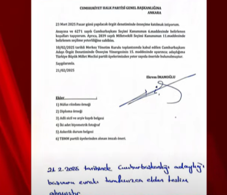 İstanbul Büyükşehir Belediye Başkanı Ekrem İmamoğlu, Cumhuriyet Halk Partisi (CHP) tarafından düzenlenen Cumhurbaşkanlığı ön seçiminde resmen adaylık başvurusunu yaptı. İmamoğlu'nun avukatı aracılığıyla CHP Genel Merkezi’ne iletilen başvuru dilekçesinde, İmamoğlu’nun adaylık sürecinin başladığı duyuruldu. Adaylık için yapılan başvuru, partisinin cumhurbaşkanlığı seçimindeki resmi adımlarından biri oldu.