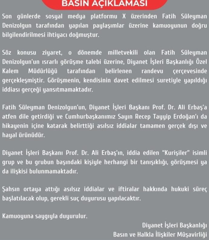 Diyanet İşleri Başkanlığı, Denizolgun’un açıklamalarına karşılık olarak bir yalanlama yaptı. Diyanet, Denizolgun’un iddialarının 'gerçek dışı ve hayal ürünü' olduğunu belirterek, hakkında hukuki işlem başlatılacağı duyuruldu. Ancak Denizolgun, açıklamasının arkasında durarak, 'Bu iddiaların ispatını mahkemelerde yapacağız. Başka sürpriz belgeler de olacak' diyerek, konunun peşini bırakmayacağını ifade etti.