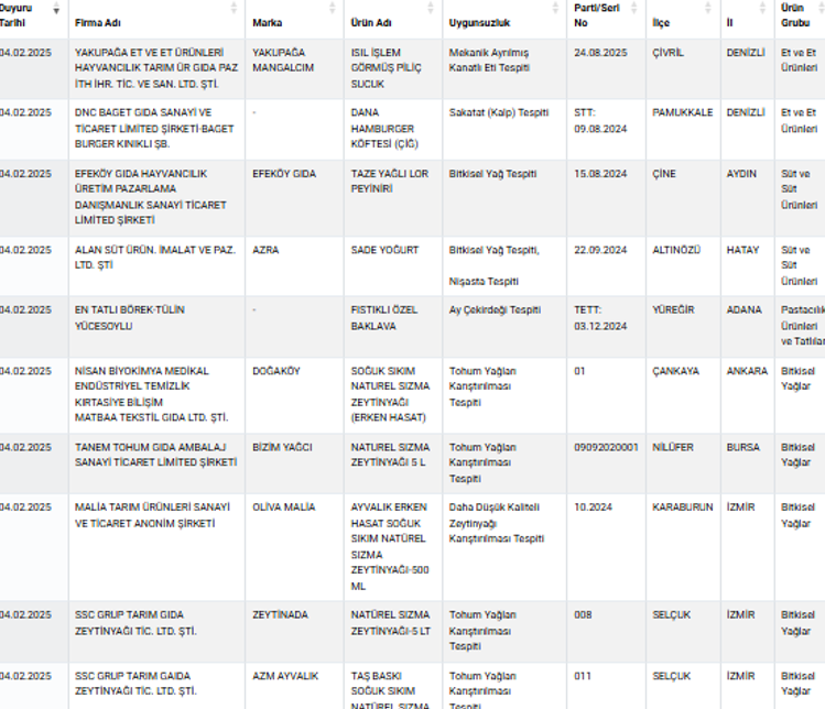 Tarım ve Orman Bakanlığı, vatandaşların sağlığını tehlikeye atacak şekilde bozulmuş, değiştirilmiş veya taklit ürünlerle ilgili yaptığı denetimleri sıklaştırarak, yeni bir liste yayımladı. Bakanlık, gıda güvenliği açısından kritik öneme sahip olan ve tağşiş yapıldığı kesinleşmiş ürünleri kamuoyuna duyurdu.