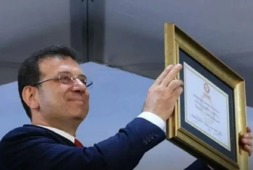 İmamoğlu, büyük boy baskılarla getirdiği eğitim belgelerini göstererek tüm evrakların gerçek olduğunu söyledi. “İyi ki saklamışım, yarın birileri iftira atar diye tutmuşum” ifadelerini kullandı.