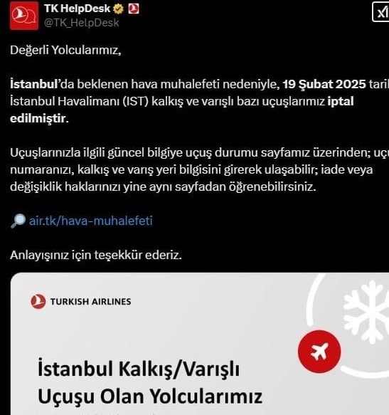 İstanbul'da etkili olacak olumsuz hava koşulları, ulaşımda aksamalara yol açtı. Türk Hava Yolları (THY), İstanbul Havalimanı'ndan yapılacak bazı uçuşların iptal edildiğini duyurdu. Şehirde beklenen kar yağışı ve kötü hava şartları nedeniyle, 19 Şubat 2025 tarihli kalkış ve varışlı uçuşlar etkileniyor. THY'nin resmi sosyal medya hesaplarından yapılan açıklamada, yolculara uçuş durumlarını takip etmeleri ve iade ya da değişiklik haklarını öğrenmeleri için uçuş numaralarıyla birlikte, havayolu şirketinin internet sitesini ziyaret etmeleri tavsiye edildi.