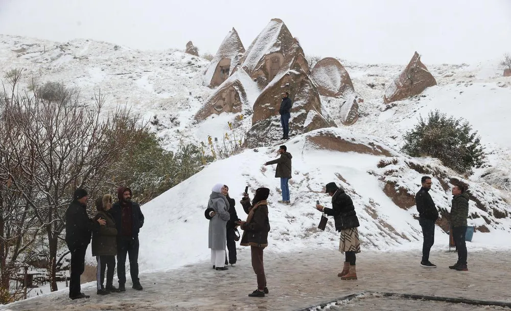 Nevşehir ve çevresinde sabaha karşı başlayan kar yağışı, Kapadokya’nın vadilerini beyaz örtüyle kapladı. Yerli ve yabancı turistler, karla kaplanan peribacaları ve doğal kaya oluşumları arasında yürüyüş yapıp fotoğraf çekti. Sararmış sonbahar yaprakları ile kar beyazlığının birleşmesi, bölgeye masalsı bir görüntü kazandırdı.