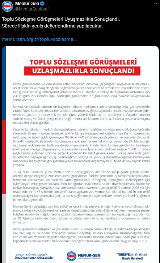Memur-Sen, konuya ilişkin yaptığı açıklamada sürecin Hakem Heyeti aşamasına geçtiğini duyurdu.