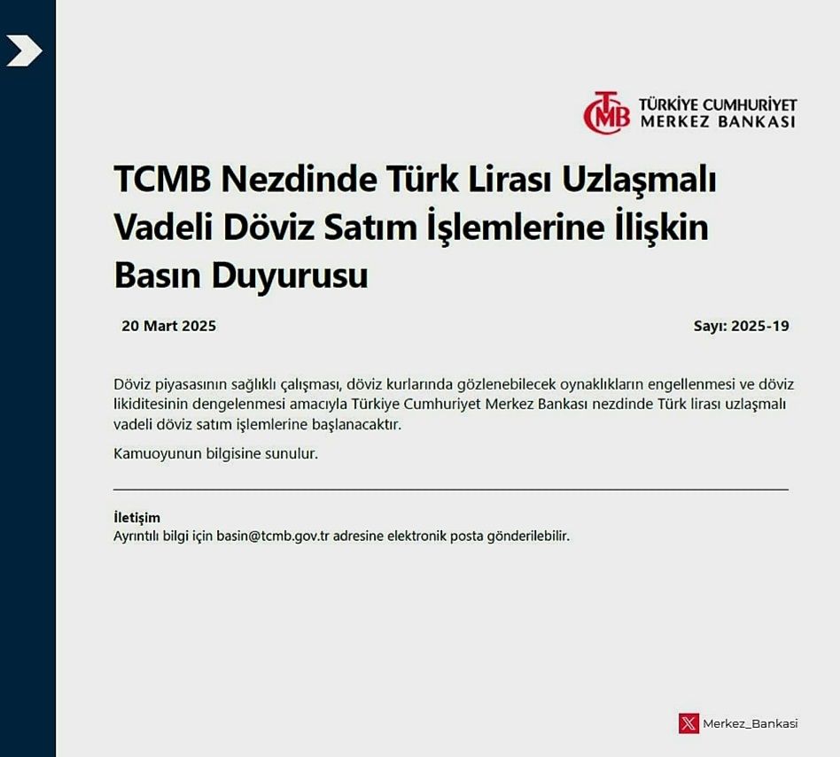 Merkez Bankası tarafından yapılan duyuruda, döviz piyasalarının sağlıklı işleyişinin korunması ve kur oynaklıklarının önüne geçilmesi amacıyla Türk Lirası uzlaşmalı vadeli döviz satım işlemlerinin devreye alınacağı ifade edildi. Bu önlem, döviz likiditesinin dengelenmesi ve döviz piyasasında yaşanabilecek spekülatif hareketlerin sınırlanması amacıyla atılacak önemli bir adım olarak değerlendiriliyor.